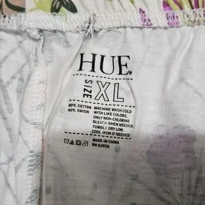 HUE pants with a floral design. Features purple and green highlights. Stylish and comfortable.