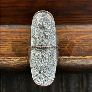 This exquisite silver ring features detailed filigree patterns and a unique crescent moon design, offering a touch of vintage elegance. The oxidized finish enhances the intricate metalwork, making it a standout piece in any jewelry collection. It’s a Southwest Sunrise to Sunset sterling silver ring size 6.