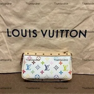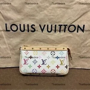 Chic Louis Vuitton clutch with vibrant monogram design. Features a white base with colorful accents. Ideal for stylish outings.