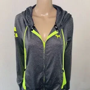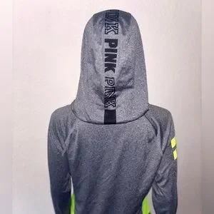 Dark grey color throughout with neon green accents down the sides, drawstrings, zipper, and Victoria’s Secret logos. The thin, lightweight material is perfect for throwing on after the gym!