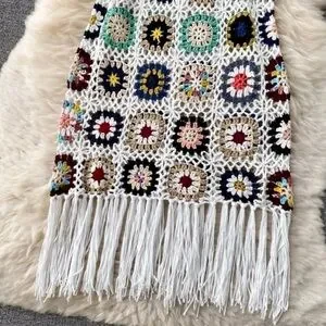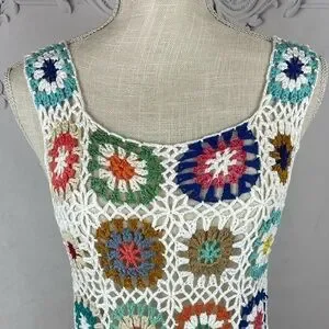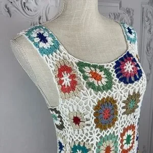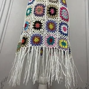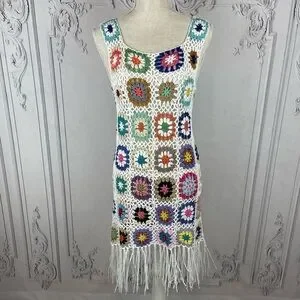 Embrace bohemian style with this colorful crochet midi dress. Perfect for any occasion, this dress features a vibrant mix of colors and a unique fringe detail. Stand out with its artistic design and comfortable fit.