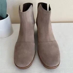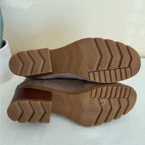 Elegant taupe ankle booties by Sorel. Features a sturdy block heel. Ideal for versatile styling.