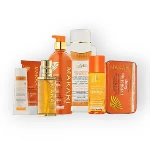 Makari skincare set featuring lotions, soap, and serum. Vibrant orange and white packaging.