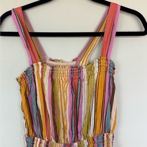This Anthropologie sundress features a delightful blend of pink and yellow hues, perfect for casual resort wear. The sleeveless design with spaghetti straps offers a breezy feel, while the midi length adds a touch of elegance. Crafted for comfort, it's an ideal choice for warm weather outings. Missing sash/tie.