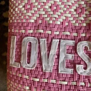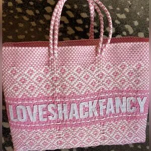 Loveshackfancy x Leslie Sulman pink woven logo St Barts tote bag beach bag