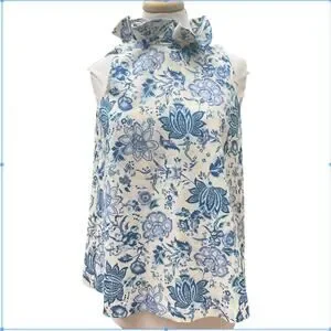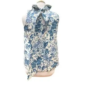 Elegant sleeveless blouse with a floral pattern. Features a high neck with a bow detail. Perfect for casual or dressy occasions.