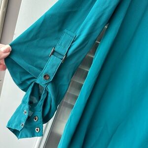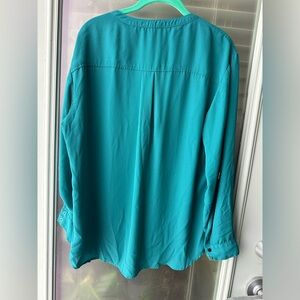 Adrianna Papell Women’s Teal Blouse. Great details on button up V-neck & roll tab hardware. Sleeves can be worn down or rolled up. Approximate measurements: PTP ~24”, Length ~26” Material: 100% Polyester
