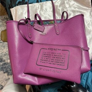 This stylish reversible tote with wrislet from Coach is crafted with smooth leather-like material and features elegant gold-toned hardware. Its spacious design makes it perfect for everyday use, combining both fashion and practicality.This is sold as is look at photos closely open to offers comes with wristlet/pouch