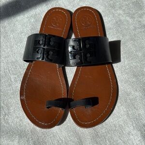 Elegant Tory Burch slides with black straps. Tan leather sole. Ideal for everyday style.