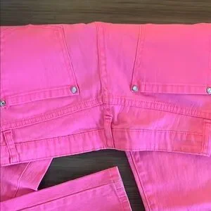 Vibrant pink jeans with a classic fit. Rhinestone details on pockets and button closure instead of grommets. Perfect for adding a pop of color to any outfit. I’m a six and wore this size fine!!