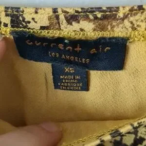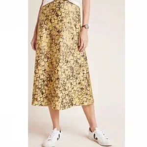 Purchased at Anthropologie. EUC. Lovely mustard golden yellow a-line slip skirt with brown and bronze metallic accent. Thin waist band in terms of width. 100% polyester. No damage or flaws noted. Pet and smoke free home.