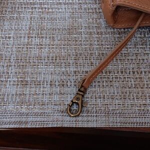 2 inside compartments and attached key clip. Year-round investment piece with a whole life ahead of her.2 small spots, see pics.1 on front and 1 in back.Length 12" approx. Height 7 inches Roomy, For everyday wear.