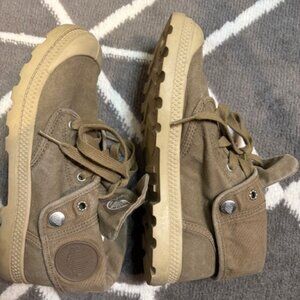 Gear up for adventure with these rugged Palladium canvas lace-up boots, built for comfort and durability. Featuring a heavy-duty rubber sole with deep lugs for superior traction, these boots are ready to handle a variety of terrains. The high-top design offers ankle support, while the durable olive green canvas upper adds a military-inspired, utilitarian look.