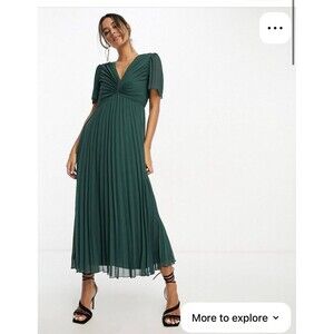 The new ASOS Pleated Bodice Flutter Sleeve Pleated Dress in Pine Green is a stylish and elegant choice for various occasions such as weddings, parties, formal events, and business functions. The dress features a flattering pleated bodice and short flutter sleeves, made of polyester material in a solid green color. With a midi length and a zip closure, this dress is designed for a size 4 and offers a designer theme with a touch of sophistication. Perfect for women looking for a chic and versatile option for their next special occasion.