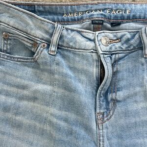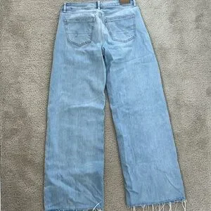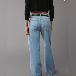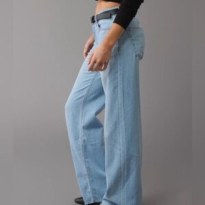AE Dreamy Drape Stretch Low-Rise Baggy Wide-Leg Jean in light denim.