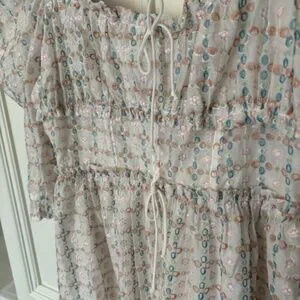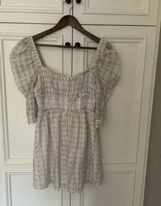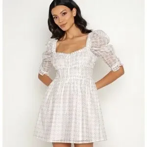 For Love & Lemons Libby Mini Dress. NWT, women’s small. White eyelet pattern with pink/blue detailing, puff sleeves.