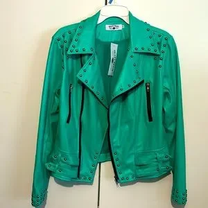 Crazy Train teal faux leather studded moto jacket