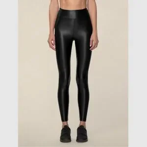 Experience the perfect blend of style and comfort with Koral's black leggings, featuring a high-waisted design and a glossy, leather-like finish. These form-fitting leggings offer a seamless, lustrous look, ideal for both athletic activities and fashion-forward outings. Crafted from a stretchy material, they ensure a snug fit from waist to ankle, making them a versatile addition to any wardrobe.