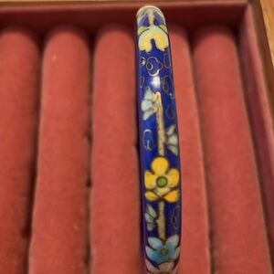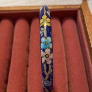 This is a very pretty antique, blue, floral bracelet. It features a floral pattern on the exterior and gold pattern on the interior.
