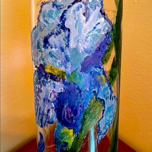 Elegant hand-painted floral design on a glass bottle. Features vibrant blue petals and lush green leaves. Butterfly conveys enchanting flight in the garden. Perfect for home decor.