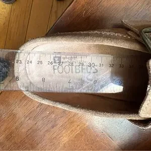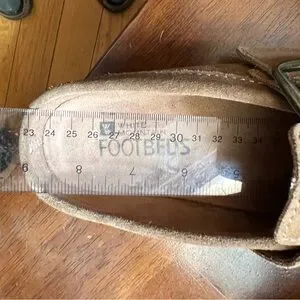 Stylish tan suede clog with a buckle detail. Perfect for casual wear. Should fit women’s 6, maybe 6.5. See measurement. New, no box.