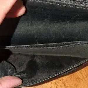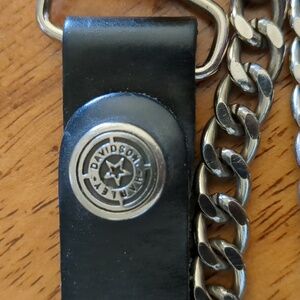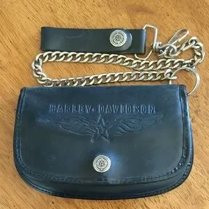 This Harley-Davidson black leather wallet features a sturdy chain for added security. Perfect for keeping your essentials safe and stylish. Used good condition