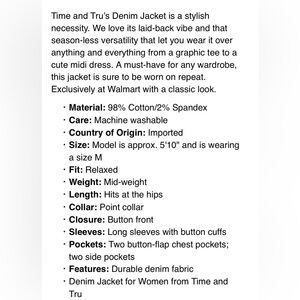 The Time and Tru Blue Jean Jacket is a versatile piece that combines classic denim styling with a medium blue wash. Its standard fit and topstitching details make it a perfect addition to any casual wardrobe, offering both comfort and timeless appeal.