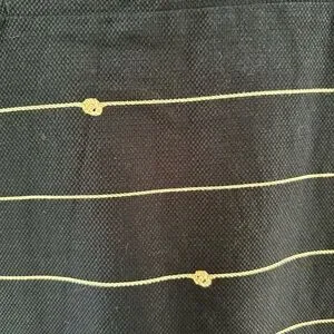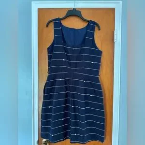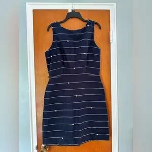 Elegant navy midi dress with cream stripes. Sleeveless and stylish. Ideal for any occasion.