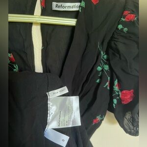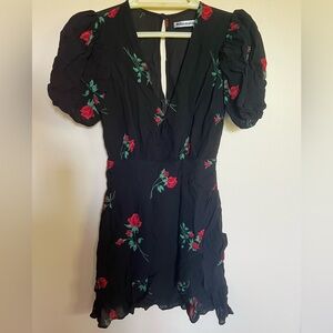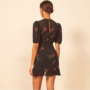 Reformation Alcott mini dress in Rochell print Black with red floral pattern. Faux wrap effect with v-neck. Ruffle at hem. Back zip. Worn once, in perfect condition.