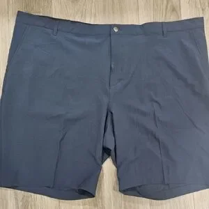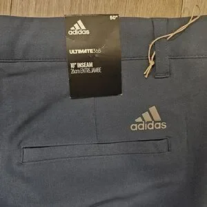 The Adidas ultimate365 NWT men's shorts in blue, size 50, are a versatile and stylish addition to any wardrobe. These chino-style shorts feature a button and zipper closure, a 10-inch inseam, and a comfortable regular fit. Made from a blend of polyester and cotton, they are lightweight, stretchy, and perfect for various occasions such as travel, casual outings, workwear, and formal events. The shorts also boast a logo accent, slash pockets, and are machine washable for easy care. Perfect for all seasons, these shorts offer both style and functionality for the modern man.