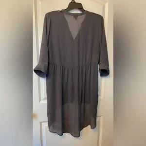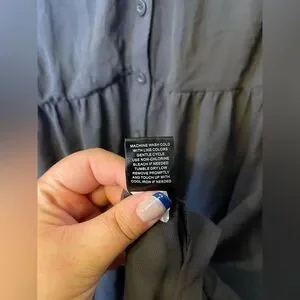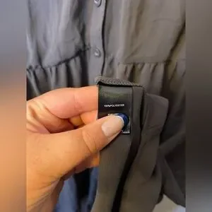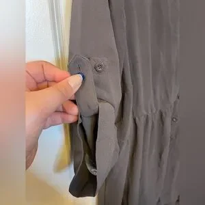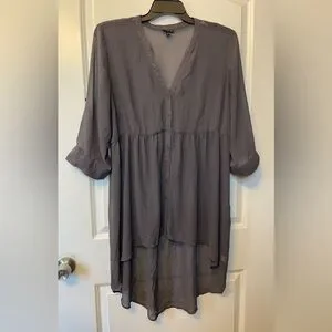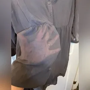 Stylish gray button-up tunic blouse with a flowy design. Perfect for casual or dressy occasions.