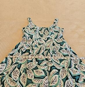 Key Info: dress, sleeveless, print, leaf, white, green, Anne Klein, Sz. 8, scoopneck, fit & flare, cotton, lined