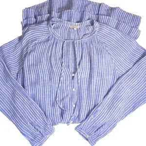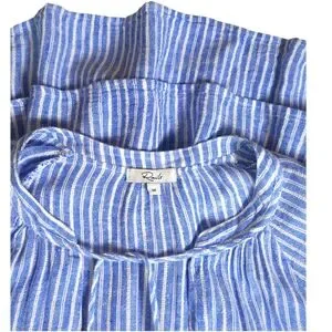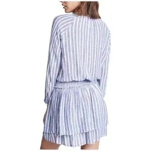 RAILS ‘Jasmine’ Azure Stripe Summer Linen Blend Sundress Blue & White Striped Dress- Shirtwaist Style on Top with a Smocked Waist and a Flouncy Tiered Layered Skirt Pearl Buttons Down the Front & at the Sleeves