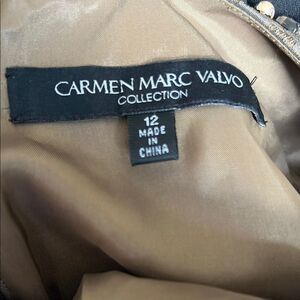 Luxurious satin dress by Carmen Marc Valvo. perfect for a wedding or cocktail party. embellished top. Jaquard sheath midi dress in bronze color with pockets. has a few missing jewels but nothing major. see last pic
