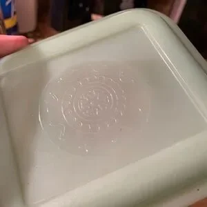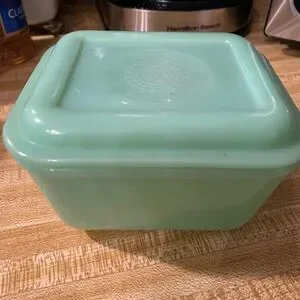 Vintage Fireking jadite refrigerator dish has chip underneath but not rim