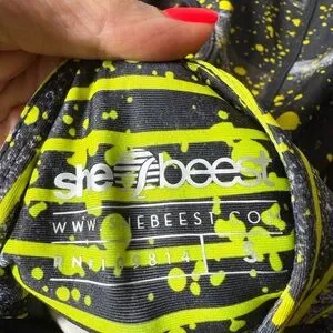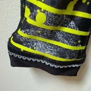 Stylish black and yellow cycling jacket with a zip-up front. Features a dotted and striped pattern.