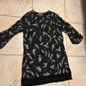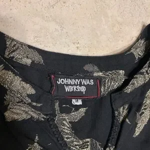 Elegant Johnny Was dress in black with a gold feather pattern. Ideal for any occasion. Size medium.