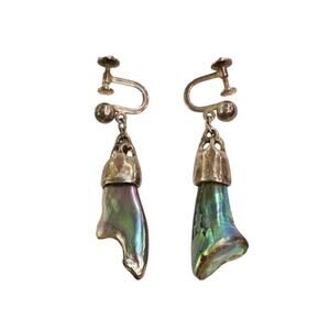 Each iridescent pearl displays the mesmerizing "orient" – the play of colors unique to abalone, shimmering with greens, blues, purples, and pinks. They are elegantly suspended from sterling silver screwback findings, a popular mechanism indicative of mid-20th century jewelry. Marked "Sterling", these earrings reflect their authentic silver content. There is some wear to the nacre consistent with their vintage age, which only adds to their unique character and history. These captivating earrings measure approximately 1 15/16" long from the top of the earring.