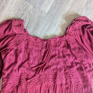 women's red (maroon/wine ish) peasant top blouse. The sleeves are 3/4 length and the top has a square neckline and stretchy back panel so it's comfortable.