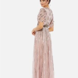 This stunning pink gown by Mac Duggal is adorned with shimmering sequin embellishments, perfect for a bride or wedding guest. The dress features a flattering A-line silhouette with a crew neck and flutter short sleeves, offering a blend of elegance and sophistication for any special occasion.