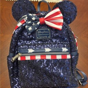 Charming Disney backpack with shimmering navy sequins. Features a patriotic bow and accents. Perfect for the 4th of July