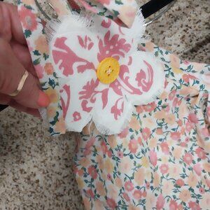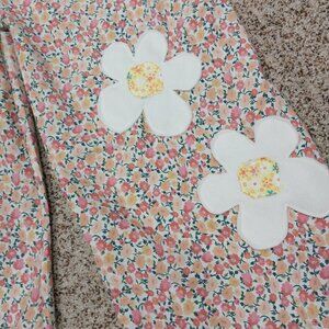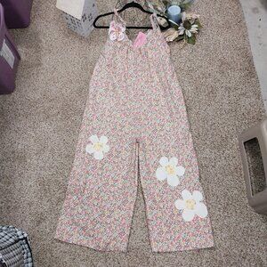 3527 Size XL Handmade Jumpsuit In Gold and Pink with Appliqued Flowers. Pit to pit 23" length 50" Tie shoulder.