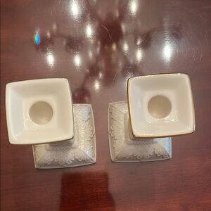Add a touch of elegance and spirituality to your home with these beautiful Lenox Jewish Sabbath candle holders. Made of creamy porcelain and adorned with 22K gold gilding, these large square holders are suitable for taper or dinner candles. These candlesticks are discontinued.