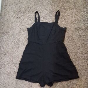 This sleek black jumpsuit from Old Navy features a fitted waist and spaghetti straps, offering a chic and streamlined look. The one-piece design includes shorts, making it a versatile choice for various occasions. Crafted from solid black fabric, it provides a simple yet elegant style.