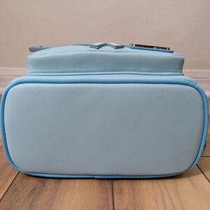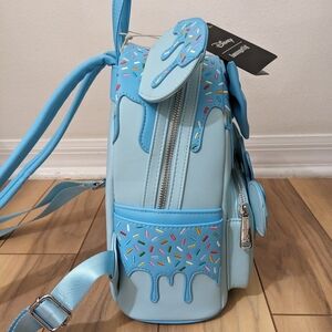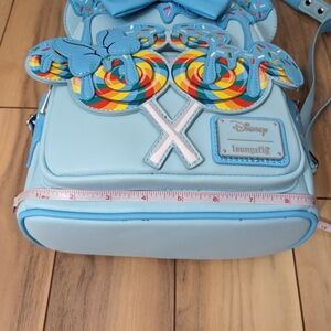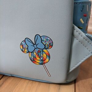 NWT! Loungefly Disney Minnie Mouse Lollipop And Sprinkles Mini Backpack. Super cute! This light blue Loungefly backpack features the Mickey and Minnie lollipop and sprinkles. It has a zip top, a front zip pouch, and a pocket on both sides. It also has Mickey ears on top and a bow on the front. This would be a great travel backpack for an upcoming Disney trip! Measurements are shown in the photos. It comes from a smoke and pet free home. No defects found upon final inspection. Message me if you have any questions. Enjoy!