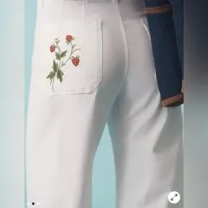 White with 3 sprout strawberry patch on each back pocket/embroidered (It’s so cute. I was complimented EACH time I wore these!!)