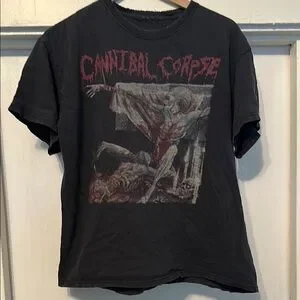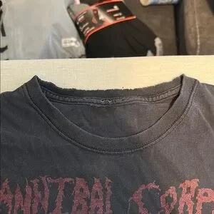 Shirt with the original Cannibal Corpse logo. It’s an old worn shirt that has a couple of holes and a bit of fraying around the neck adding to the vintage look.