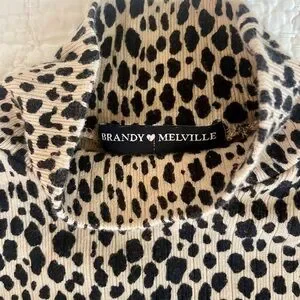 The Brandy Melville cheetah print mock neck top, also known as the John Galt "Ashlyn Top", is a popular item, especially among those seeking a cropped, fitted look with a distinctive animal print. It's often described as mock turtleneck in a baby tee style with a cheetah (or leopard) print. The color is typically tan with black dots.