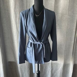 This sophisticated blazer from White House Black Market features a shawl collar and a tie belt, offering a tailored fit in a versatile blue hue. Its minimalist design and smooth fabric make it ideal for professional settings, while the wrap style adds a touch of elegance.
