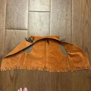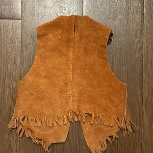 Vintage 1970s boys leather vest in a rich brown hue is a standout accessory with its classic western design. Featuring fringe details along the armholes and bottom edge, it embodies the cowboy spirit. The vest is adorned with black leather patches showcasing a longhorn steer head, adding a unique touch to its design.